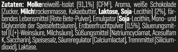 Zutaten: Molkeneiweißisolat (97,3 %) (CFM¹), Aroma, Emulgator (Soja-Lecithin), Süßungsmittel (Acesulfam K, Natriumcyclamat, Saccharin), Karamellzubereitung (Glukosesirup, Maltodextrin, Zucker), Speisesalz, Trennmittel (Siliciumdioxid), Laktase.